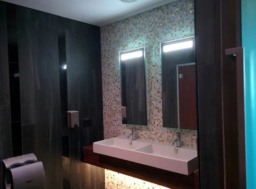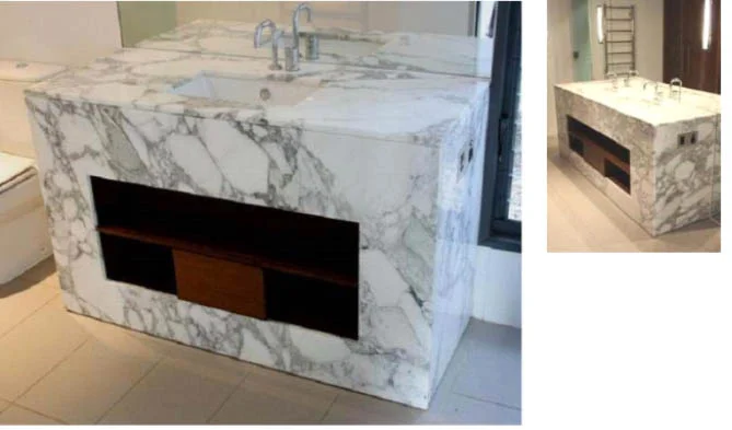 Bar Vanities - Quartz Calacatta, mitered joint detail & CT18 Matt Black Porcelain in Herringbone design.